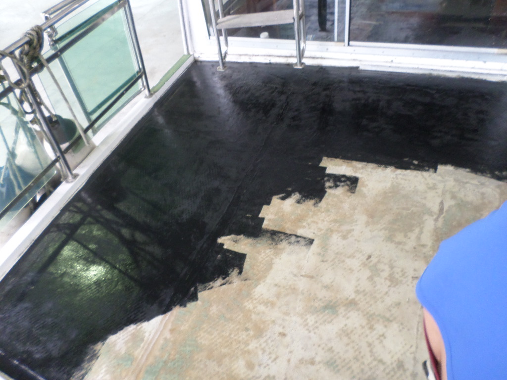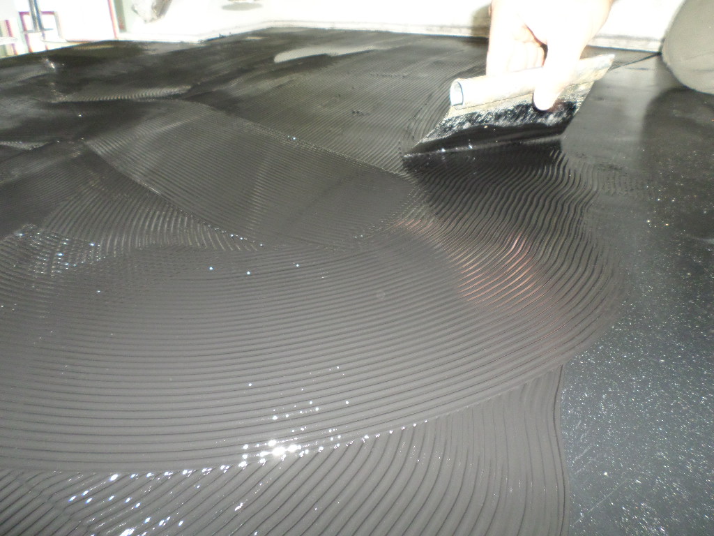 stando attenti a non sbordare dal nastro, attendere circa un’ora (ma non più di 24) quindi applicare a spatola dentata sul fondo il sika 298 su tutta la superfice senza uscire dal perimetro e appoggiare il pannello aiutandosi per la posizione con il nastro di carta. Fissare sempre un pannello alla volta, se piccolo si può spatolare di sika anche il pannello invece del pavimento comunque bisogna sempre evitare che il sika cominci ad asciugare prima che sia in posizione, se il pannello é molto grande bisogna essere in due persone, una volta posizionato si può muoverlo ma di poco altrimenti sporcherà al di fuori del suo perimetro.